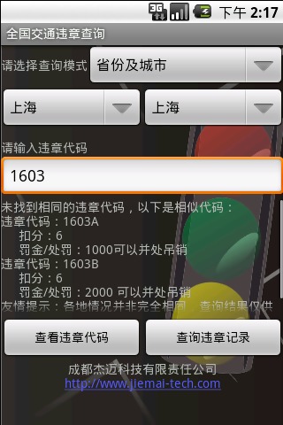 全国交通违章查询 2.6.6 安卓版 杰迈生活小助手之全国交通违章查询安卓版,能快速在手机上查询全国范围内的交通违章记录及驾照扣分信息,方便有车一族随时了解自己是否有过交通违章,避免因遗忘或逾期处理违章罚单而造成的不必要损失。
