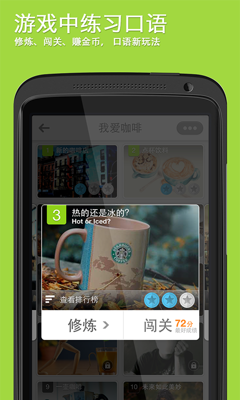 英语流利说在首页即直接给出不同场景的“关卡”,比如新手级的“国家与国籍”场景、进阶级的“电子游戏”场景,挑战级的“商业人生”场景等。选好场景即可修炼、闯关,修炼过程需要跟读原对话中的每一个句子,后台系统的语音评估技术会实时打分,只有当单词的发音标准、句子连贯性和语调都和原音相近时,用户才能得到及格以上的分数和金币奖励,否则只能面对一张红果果的哭脸了。而当你信心足够时即可闯关,扮演任意角色和另一角色对话。