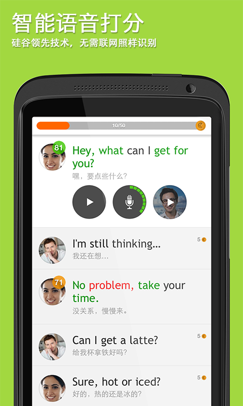 “英语流利说”是一款好玩又有效的英语口语学习应用,让你“忍不住开口说英语”,帮你真正摆脱“哑巴英语”!每日更新的地道美语对话,来自硅谷的实时语音评分技术,好玩上瘾的对话闯关游戏,让你轻松愉快练口语,不知不觉“流利说”。