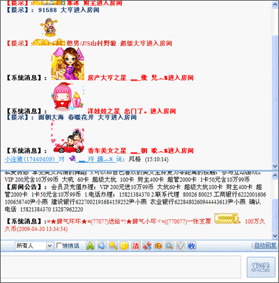 对话记录和公告栏:这里显示了聊天室里用户的公开聊天对话记录,和室主对进入该房间的用户的公告和要求。在最下方的对话框里,用户选择好自己的谈话对象,输入想说的话,对方就能看到,并且用户可以选择公开对话或者秘密交谈。