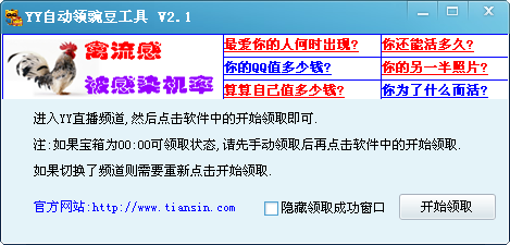 软件介绍:yy自动领豌豆工具是一款自动帮你领取yy看直播获得白豌豆的软件。喜欢看游戏直播的朋友一定都在yy直播频道看大神的直播,yy直播不仅稳定不卡,而且还有各种特色娱乐功能如领豆子赌豆子就是其中之一,相信有很多朋友都知道大神直播的时候左下角有个宝箱,宝箱会倒计时时间到了就可以点击领取相应的豆子,不点击的话就会一直领取状态,有时候容易忘记去点击领取则损失一些豆子,本软件就是为此开发的,开启软件中的开始领豆,程序即可为你自动领取豆子,让你开开心心的看游戏直播。