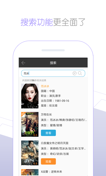 搜索功能方便用户查询影讯资料及关注信息
