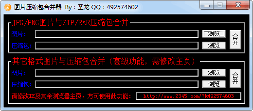 图片压缩包合并器软件可把任意格式图片和任意格式压缩包合并到一起,以jpg图片和rar压缩包为例,使用本软件把jpg图片和rar压缩包合成,合成后的文件默认后缀为jpg,看起来和之前的图片没什么区别,但是把后缀改为rar后,却变成了之前的压缩包,而且压缩包里的文件没有半点损坏,可以成功解压。可以把合成后的图片上传到论坛上(注意不能加水印),但是经测试不能作为qq的聊天图片。