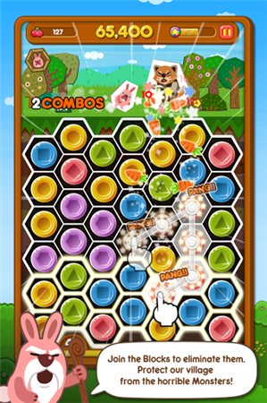 以一笔画的方式将3个以上相同颜色的方块连在一起之後,方块将会弹出蔬菜水果,攻打侵袭村庄的凶猛怪兽。您也可以将蔬菜水果升级,增加您的攻击力!