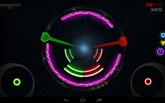 游戏共有5大关卡,每个大关卡内有着15个小关卡,玩家需要通过滑动箭头或者使用屏幕左下角或右下角的摇杆,来触碰刚好碰到圆的外边上的圆弧。看起来很简单,其实还是有点难度的。小编初体验了一下,在绿色箭头和红色箭头同时出现时,发现一个脑子完全不够用,哎!玩家还可以赚取金币的方式来进行升级。在设置中,还能设置色盲模式,使红绿色变成蓝绿色,可谓考虑周全。