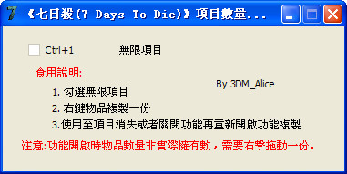 开啟功能后,物品数字变為999(实际数非999)请不要直接使用物品。右击需要复製的物品,拖动一份到其他格子,关闭功能。物品实现999数量。不关闭功能也可以,不过物品数量则為499(但是显示999)使用至消失后再右击物品复製即可。切记,让背包里拥有两个格子相同的物品避免物品使用完。
