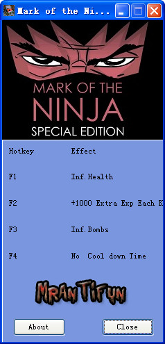 忍者印记特别版修改器 v1.0 绿色免费版 忍者印记特别版修改器是针对于同名游戏忍者印记最新出的特别版的辅助工具,拥有生命,炸弹,冷却时间等修改功能,帮您轻松完成游戏。