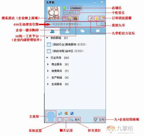 九掌柜是一款即时商务通讯软件,是一款基于即时通讯群交互技术、可以让企业仅通过客户端工具、通过聊天的方式就能轻松实现一站式信息化的O2O(线上咨询、线下交易)平台。