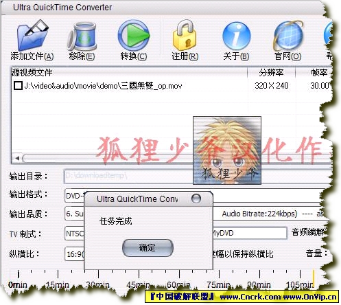 强大易用的 QuickTime MOV, QT, MP4, M4V 转换器,可将输入文件转为 AVI, DivX, Xvid, MPEG1, MPEG2, VCD, SVCD, DVD 等等格式,内置 QuickTime 解码器,无需安装 QuickTime Player,支持批量转换和视频分割。支持输出 DVD 目录结构(VIDEO_TS, AUDIO_TS)及 DVD/SVCD/VCD 盘片映像,以便您使用第三方刻录软件刻录到盘片上。如果您没有或讨厌安装 Nero 这样的巨无霸的话,译者建议您使用小巧而全能的 ImgBurn 汉化版来刻录!软件的“方案”部分跟命令行挂钩,如果汉化会造成无法正常转换部分格式,故而保留原样!然后据此花费了大量的时间来测试软件的全部功能,全部 OK 的说:)