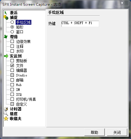 SPX Instant Screen Capture 是一个功能强大的屏幕图像捕捉程序,支持鼠标和快捷键两种捕捉方式,支持任意图形、长方形、窗口、整个桌面四种捕捉范围,捕捉后的图片可以直接复制到剪贴板,保存为文件,用Email发给朋友,通过内置的FTP软件上传到网站,发送给图像编辑工具进行编辑修改,或者发送给打印机或者传真机,程序还具有在设定的时间间隔内连续捕捉和对捕捉的图片进行发大缩小的功能!