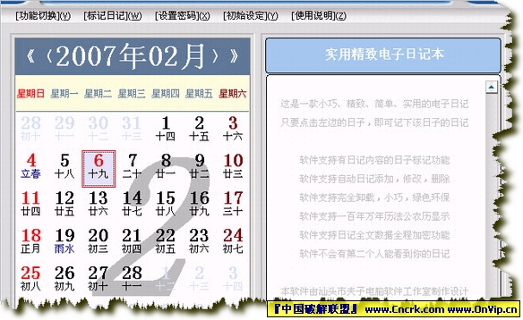 精致日记通讯录 V2007 Build 04.01 〖精致日记通讯录〗软件是一个精巧、实用的电子日记及电子通讯录软件。软件包括日记本和电话本两大功能。日记本界面精美、简洁、实用、方便,添加修改删除极其简单,日记支持日历标示功能,哪些日子有日记内容一目了然,软件支持自动添加日记,自动保存日记,日记内容全程加密,绝对不会有第二个人能看到你的日记。电话本界面简洁,实用,添加、修改、删除、查阅极其方便,操作简单。软件支持无限量添加日记及添加电话本功能。软件支持完全卸载。软件同时还包含一百年万年公农历功能。软件绿色、环保、小巧、精致。功能强大、操作简单