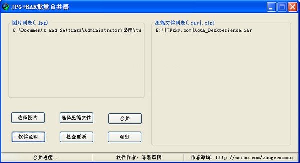 本软件能够批量的将JPG图片格式文件与RAR|ZIP格式压缩文件进行合并,合并之后的文件默认存放在压缩文件所在文件夹中,合并之后的文件后缀格式改为JPG则为之前正常的图片,改为RAR|ZIP即为之前正常的压缩文件,