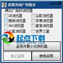 勾选弹出广告的浏览器,再按监视按钮,如果浏览器弹出窗口则会自动关闭。