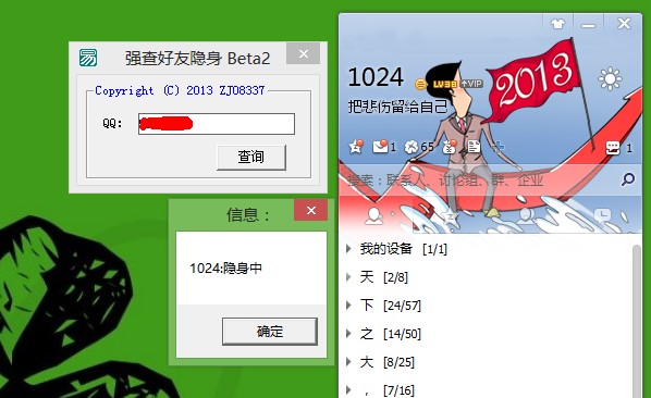 强查好友隐身Beta2 全面版 这款强查好友隐身小工具本身存在是没什么意义的,因为人家QQ已经隐身就代表着她这会没空对你,但我觉得说不定你能好好利用上她来搭讪,比说说她这会在线,你发个“嘿,我感觉你这会在线。。。”之类的.当然摩羯座的我本身不会这方面的东西,所以自己把握吧。