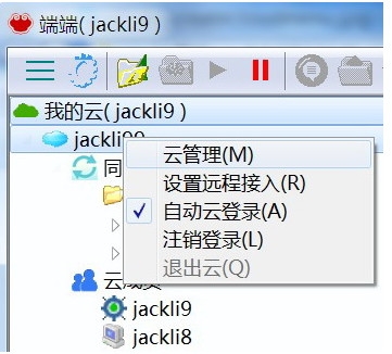 第二步:云的创建人是唯一的云管理员,只有管理员才能增加或者删除成员。鼠标右击云名字,选择菜单【云管理】。如果是您的其他电脑使用,则可以通过克隆新用户功能,一键实现用户注册和添加云成员,注意密码和注册邮箱与当前用户相同,只有用户名不同,新注册用户用于其它电脑客户端登录;也可以输入您的朋友的注册用户名字,单击【添加成员】加入您创建的云。云成员登录系统后通过clouduolc智能路由搜索相互之间能够找到对方,形成一个小型的私有云。要删除成员,则选中成员用户,然后点击【删除成员】即可,当成员只剩下自己时,也可以解散整个云。