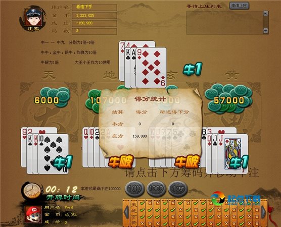 2、 每个闲家的底注不一定相同,当闲家的银子小于庄家时,取自己银子的第一位÷100为底注,当闲家的银子大于庄家时,取庄家银子的第一位÷100为底注。闲家下注时可以选择1倍、2倍、5倍、10倍底注之中的一种进行下注。
