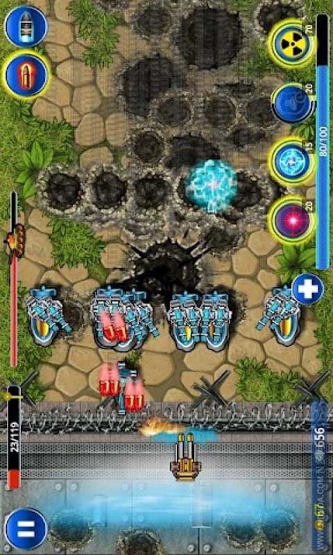 在游戏中你控制炮塔你的基地上移动,并开动机枪或重型火砲的砲塔。砲塔由力场的保护,所以它可以“捕捉”敌人的砲弹,防止基地的损害。摧毁每一个敌人你将获得银币和金币,完成任务,并保护你的基地。你可以钱升级武器和保护基地,以及改善特殊武器!您还可以得到各种成就的奖项。