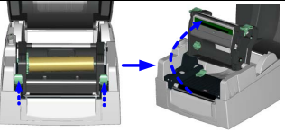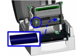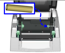 2. 依图示方向,先将空的碳带回收纸卷轴从右方的碳带固定轴装入后再加以固定。