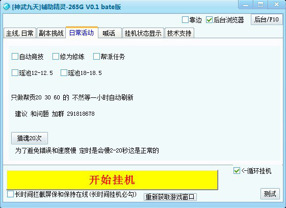 神武九天辅助是一款精心为神武九天制作的免费游戏辅助器,它有自动喊话、副本挑战、自动竞技、修为修练、帮派任务等功能。可以让您以最短的时间获得最大的收获,欢迎下载使用。