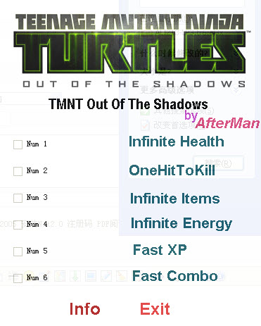 忍者神龟:脱影而出修改器是同名游戏忍者神龟:脱影而出修改器的辅助工具,共添加了6项修改功能,操作简单,帮助玩家轻轻松松度过难关,喜欢的朋友来下载哦