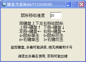 十二路键盘鼠标器 V1.0 绿色免费版 十二路键盘鼠标器是一款用键盘完成鼠标操作的工具。如果你点鼠标点累了,可以试试十二路键盘鼠标器,用全键盘的形式控制鼠标也需是个非常有趣的事情,说不定用键盘完成鼠标的操作或许比用鼠标本身来完成要快。赶紧下一个十二路键盘鼠标器来试试吧。