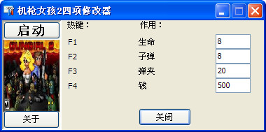机枪女孩2修改器4项功能辅助工具,拥有生命,子弹,弹夹,金钱的修改功能,让您轻松完成游戏。 使用说明 运行修改器,启动游戏。