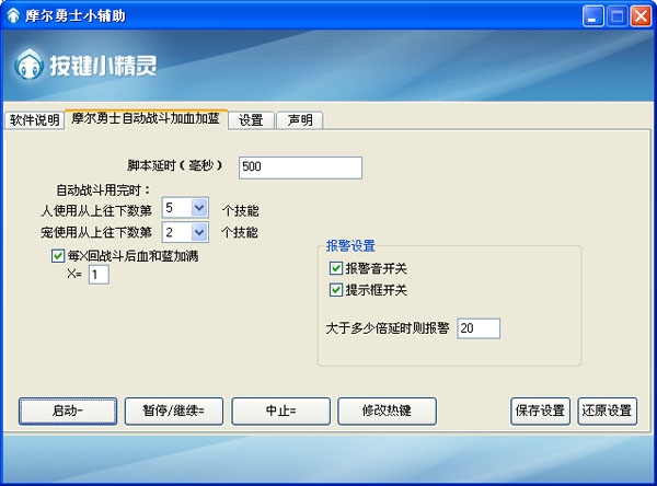 摩尔勇士辅助是使用按键精灵编写的脚本工具,专用于摩尔勇士游戏,提供自动战斗、加血、加蓝等功能,有清晰的界面方便设置,可以最小化窗口,可以无限多开重复运行(设置完后打开大号窗口,启动,再设置一下,移到小号1的窗口启动,以此类推),当你开了N个小号,而且自动战斗用完的情况下,摩尔勇士辅助可以帮你省很多力气。