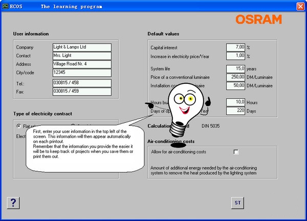 ECOS能够计算包括新型的或是升级后的整个照明系统的成本。您只要输入关键数据,其余的计算将由软件自行完成。