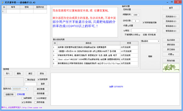 天天爱中奖活动助手是一款不错的活动辅助,天天爱中奖活动助手天天爱中奖活动助手可以轻松获得最新有奖活动的奖励,包括Q钻、Q币、手机等,同时通过本软件,能够及时了解最新活动信息,活动达人们,赶紧下载收藏吧。