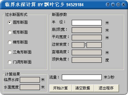 临界水深计算工具 V1.0 绿色免费版 临界水深计算可以计算圆形断面、矩形断面、梯形断面、三角形断面、门洞型断面五种过水断面的临界水深。