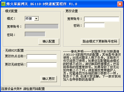 烽火家庭网关配置程序为了方便大家开启家庭网关的路由模式,特别制作了烽火家庭网关HG110-B快速配置程序,只支持联通宽带,默认应该是桥接模式,使用本家庭网关配置程序,可以轻松开启路由功能,有兴趣的可以试一试。