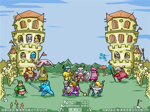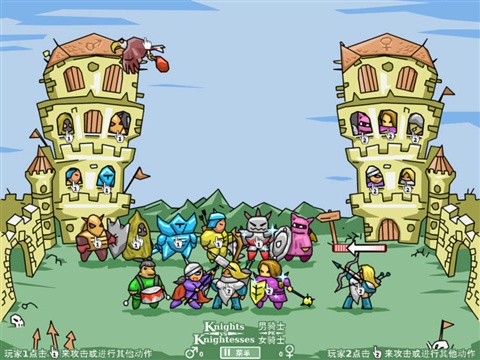 男骑士PK女骑士是一款适合二人来玩的非常有趣的战场游戏,展现实时动作。两军对战一类的小游戏,玩的时候可以进行两人同机对战,比较适合情侣之间或者说聚会的时候大家一起玩,游戏的画面感觉上给你有点复古,不过玩法上却很新鲜,就是两边分别出兵,然后对战的模式。