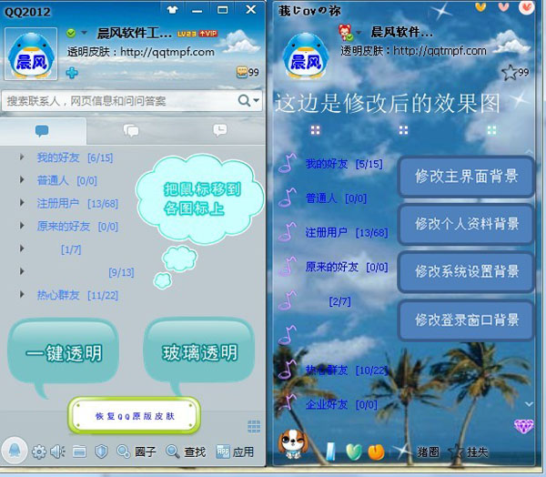 晨风qq透明皮肤修改器最新推出2014qq皮肤修改器。本款修改器页面简洁,操作简单,只需一键修改就可设置偶像、美景、爱人各类图片为你的QQ皮肤。打造最酷QQ皮肤尽在晨风qq透明皮肤修改器。