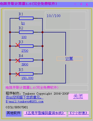 电阻并联计算器,电子工程师调试电路时经常要用到各种各样电阻的并联,这个工具提供了最直观的电阻并联界面,简单的输入几个数字即可得到并联的电阻值,完全免费无须安装的绿色软件,解压后大小仅56KB。
