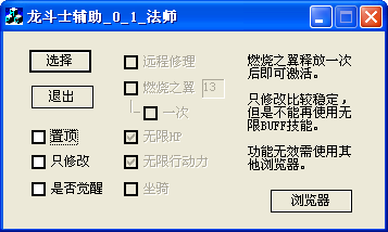 龙斗士法师无限buff是专用于法师职业的龙斗士辅助工具,龙斗士辅助使用C语言编写,页面简洁,功能强大安全免费,欢迎下载体验。