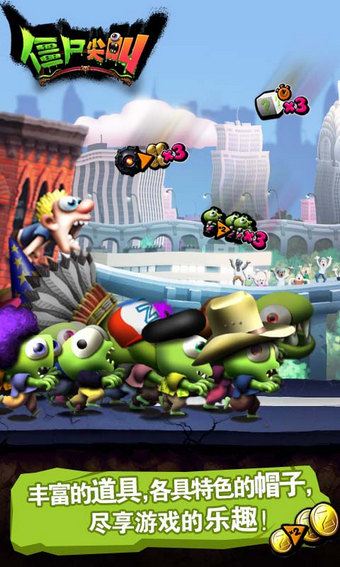 你将从拥有一个僵尸开始奔跑旅行,被你咬到的人类就能成为你的同伴,除了避开障碍和跳跃悬崖外,尽可能的将所遇到的人类都变成僵尸来壮大自己的队伍,只有一个庞大的队伍才能够更加轻松的侵略地球。在僵尸尖叫你需要有足够多的僵尸来推翻小汽车、巴士、坦克等以壮大部队。简单的说,你吃一个人,他就会变成僵尸跟着你跑,这样一来二去,你基本上就是率领着僵尸军队向前,将所有挡在你面前的东西踏平。