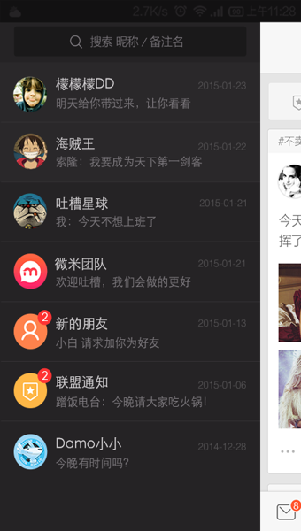 首先,微米上的群组分“公开”和“私密”两种属性,而每一个群组之上都会有一个类似“朋友圈”的独立展示页面(名为“动态分享”)。群组成员可以在动态上分享照片、文字、活动以及公告,内容可同步到微博。公开群组的动态会集中公开显示在“动态”的模块当中。而对于私密群组来说,私密群可以成为内部的工作沟通群,除了 IM 功能,也可通过动态分享实现一些内容的交流和沉淀,通过活动满足群内活动组织、报名统计的需求。群组初始的人数限定为 30 人,我们也看到一些大群有 200 人规模,随着满员、活跃度的情况,群人数可以增加。