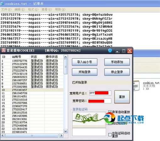QQ账号cookie提取软件 v1.0 绿色版 一款cookie提取软件,完全免费,功能上无任何限制,可以批量导入QQ小号提取COOKIES,可宽带拨号托管,可实现无需打码。使用前先解压,提取的COOKIES数据文件跟软件在同一个文件夹里面(比如你软件是在桌面打开的那么你提取到的COOKIES就是在桌面生成一个cookies.txt的文本文件里面)