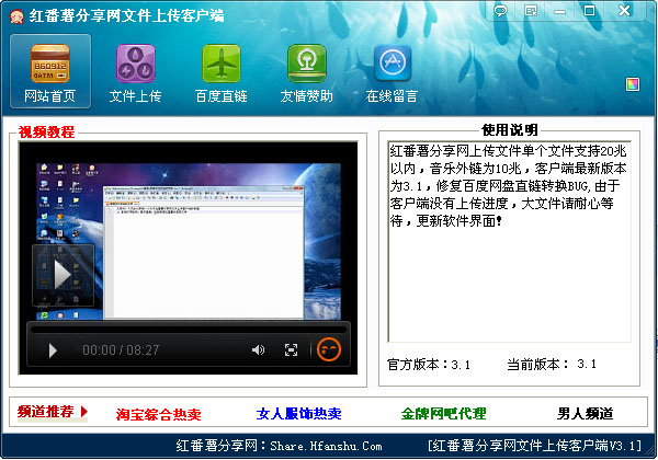 红番薯分享网文件上传客户端推出了,主要功能就是文件上传界面,上传文件可以选择上传MP3音乐文件,上传完成后会获得音乐外链地址可以在QQ空间内使用做为背景音乐,也可以使用百度直链转换功能进行转换音乐直链连接,红番薯分享网上传文件单个文件支持20兆以内,音乐外链为10兆,欢迎下载体验。