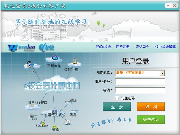 e板会云客户端是e板会的PC客户端,无需网页插件的支持,突破了网页上的各种限制,可直接在电脑上播放,支持各种windows操作系统,操作更加快捷、方便和稳定。