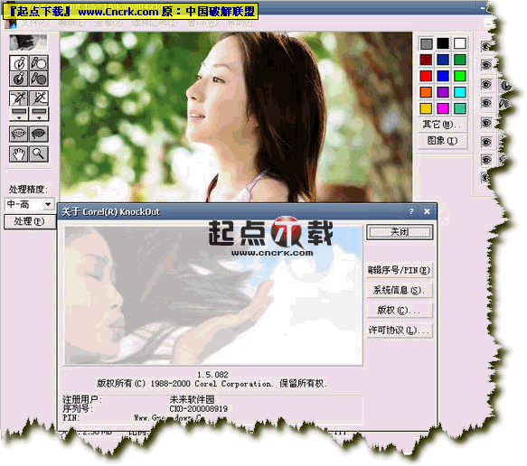 Corel 公司出品的专业去背景软件,连极细的毛发都能从复杂的背景中分离出来。专业一点的术语是制作「遮罩」,所谓的去背,指的是将特定的主体从背景中分离出来, 以便进行其它的后续设计。例如,将人物从风景照之中抽离出来,以便更换背景。 目前,其他的影像处理软件,例如 PhotoImpact、PhotoShop ...等,其实也都可以进行去背的作业,但却不及 Knockout 来得功能强大及便利。在 Corel Knockout 之中,若背景较为单纯时,我们只要定义 Inside 及 Outside 两个选取区域,再按一下处理( Process )钮,通常便能完成去背的作业。 其去背的准确、快速及方便、容易程度,可谓其它软件都难以望其项背!