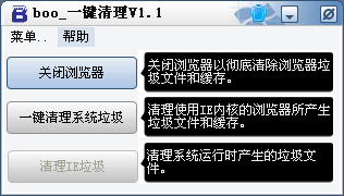 boo一键清理 1.1 安装版 boo一键清理帮你迅速清理电脑垃圾,对于磁盘处理可是特别厉害。boo一键清理能够完全清理电脑的缓存文件,一键清理,傻瓜式操作!支持托盘最小化,操作方便。电脑永久了会卡的朋友可以下载试试哦。
