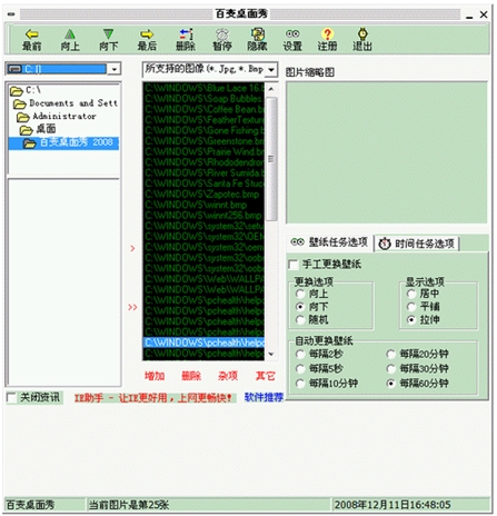 百变桌面秀 2008 Build 1210 绿色版 百变桌面秀是一款界面美观,操作简单的动态变换桌面壁纸的软件,可以用于美化您的电脑桌面。您是不是早已看厌了Windows提供的桌面背景图案?您是不是想让您的桌面背景图案定时改变,时时刻刻拥有新的背景!那么不妨下载本软件试试,相信您一定会喜欢它的^_^