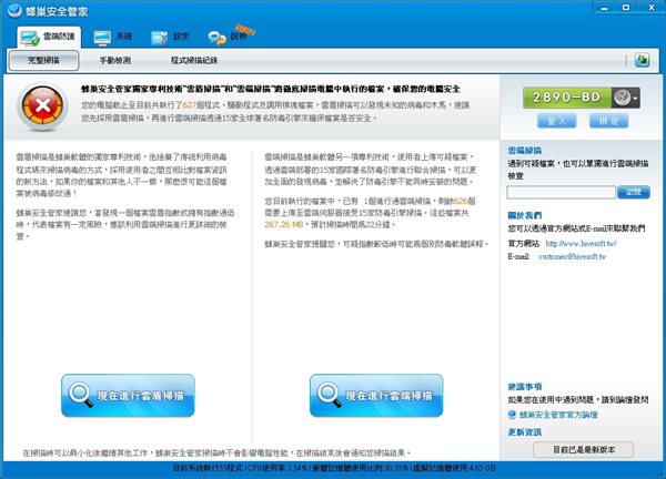 蜂巢安全管家联合a-squared、AntiVir、Comodo、Ikarus、 netgate、NOD32、nProtect、Quick Heal、Sophos、VBA32、卡巴斯基、江民杀毒、趋势科技、金山毒霸、麦克沃德等来自多个国家的15家顶级扫毒引擎,为使用者提供云端扫描功能,全面检测病毒与木马。软体可与系统防毒软件并行运作,绝无资源冲突,及系统记忆体付载情况靠极轻微,可放心使用。云盾协同扫描是蜂巢进程管家独家专利技术,他摒弃了传统利用病毒代码来扫描病毒的方式,采用海量用户之间互相比对文件信息的新方法,如果你的文件和其他人不一样,那么很可能这个文件被非法修改过。