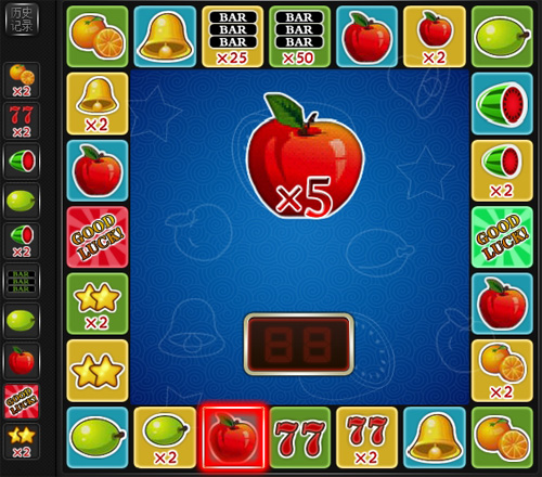 幸运水果机最为常见的是在街机厅中见到的,界面由24个方格拼接成一个正方形,每个方格中都有一个目标(多个不同的图形,通常为水果),且每个方格下都有一个小灯。玩家投入游戏币后,选择希望押注的目标,当玩家按下开始键后,小灯开始绕着正方形中每个格子转,当小灯停下来时,如果停在玩家押注的目标上时,则玩 家可赢取相应的游戏币。想要赢的更多,参与猜大小吧,你可以获得更多的金币,这就是99电玩准备的有一大特色,在保留原有的玩法上不断推陈出新