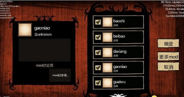 饥荒mod模式完美补丁,如果已经安装mod,在游戏主菜单点Mods按钮,会直接显示mod信息。如果没有安装mod,则将在2秒钟后自动跳回主菜单,非常方便实用,你值得拥有。