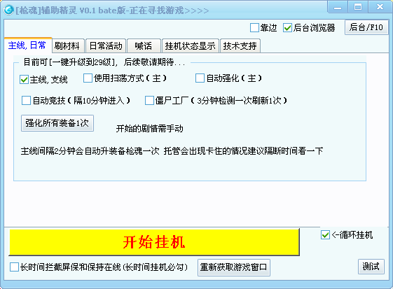 长时间拦截屏保和保持在线请勾选界面最下方的功能框;如若想重新获取游戏窗口点击获取即可