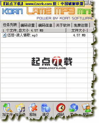 Koan Lame MP3 Mini (MP3制作) V1.0 绿色特别版 Koan Lame MP3 Mini软件主要功能是制作MP3音乐文件。软件采用了世界上最顶尖的MP3编码引擎Lame,除了支持将WAV文件转换为MP3外,还支持将不同码率的MP3重新编码为一致码率的MP3,支持ID3v1、ID3v2标签写入,也支持v2.x的写入,而且还拥有完全智能化的标签识别功能,歌名和歌手,甚至专辑名都可以自动根据文件名分析后写入,不需要用户一个一个地设定。免费绿色软件, 是广大音乐爱好者必不可少的MP3转换工具......