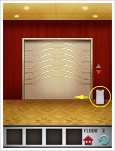 第四关的电梯门有所改变,变成了木质的门,门上有指向两边的箭头,箭头是铁质的。这关就要我们用两只手指通知按住箭头向两边拉,就能打开电梯了,进入下一关。