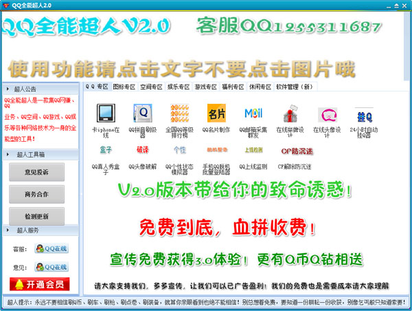 QQ全能超人是一款集QQ网赚、QQ业务、QQ空间、QQ游戏、QQ娱乐等各种网络技术为一身的全能型工具,完全免费,开启QQ全能超人后,要使用功能请点击文字不要点击图片哦,另外宣传本QQ全能超人还可获得3.0的体验资格,更有Q币Q钻相送。